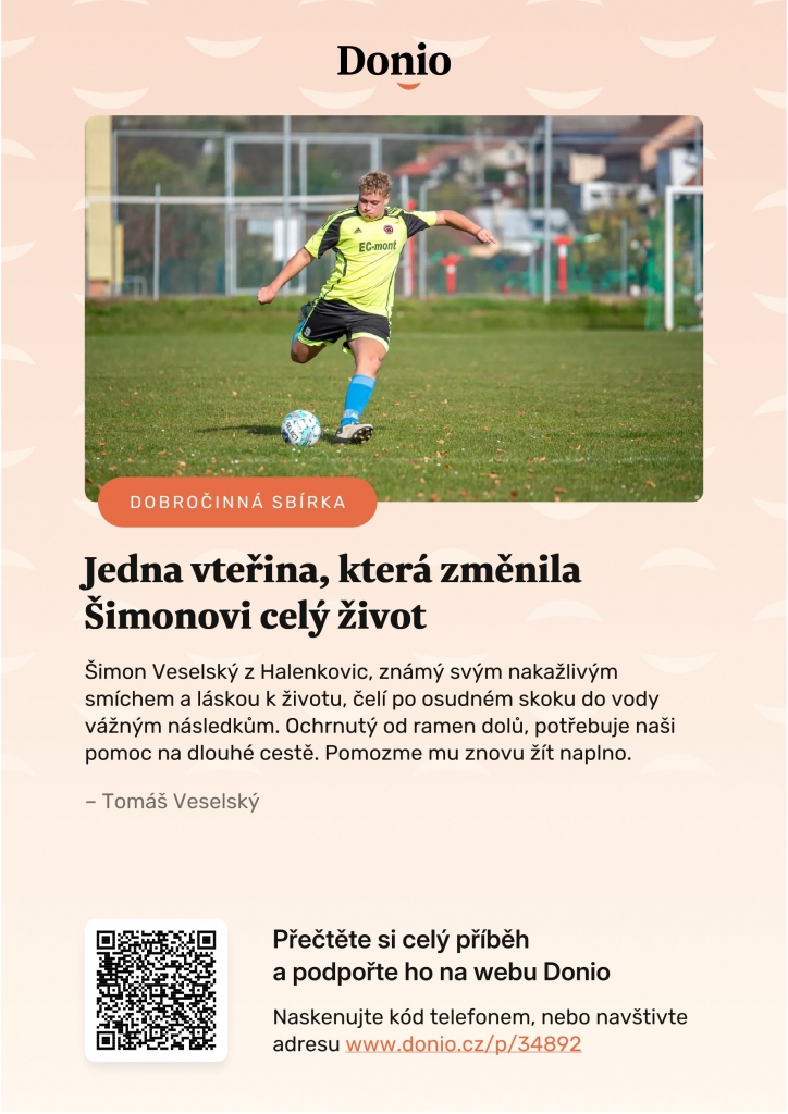 Rádi bychom Vás upozornili na sbírku na podporu Šimona Veselského, mladého Halenkovjáka, kterého zasáhl velmi vážný úraz. Podrobnosti o tom, co se stalo, najdete přímo na stránce sbírky Donio: https://donio.cz/jedna-vterina-ktera-zmenila-cely-zivotJako obec stojíme za Šimonem i jeho rodinou. Je to náš kluk, součást mladé generace Halenkovic – sportovec, kamarád, parťák. Teď má před sebou dlouhou a náročnou cestu, kterou může zvládnout i díky pomoci lidí kolem sebe.