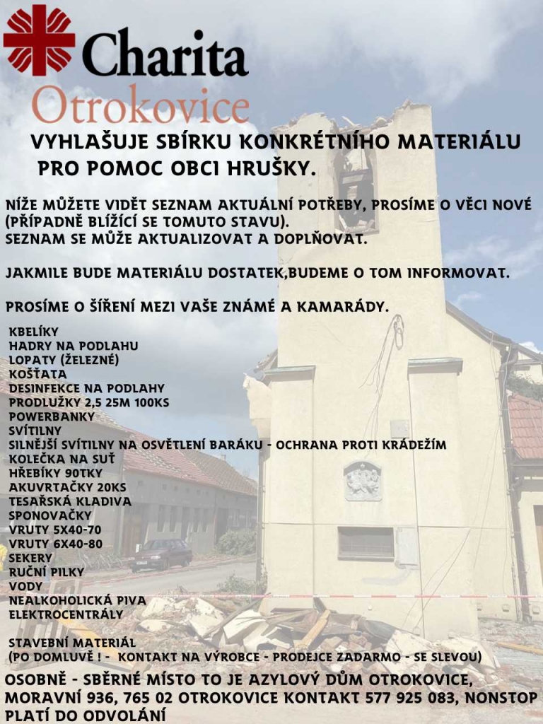 Charita pořádá sbírku materiálu pro obec Hrušky