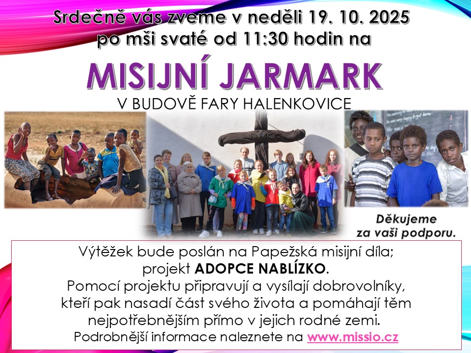 Farnost Halenkovice zve na Misijní jarmark, který se koná v neděli 19. října od 11.30 hod. v budově fary na Pláňavách. Výtěžek bude poslán na Papežská misijní díla – projekt adopce nablízko.