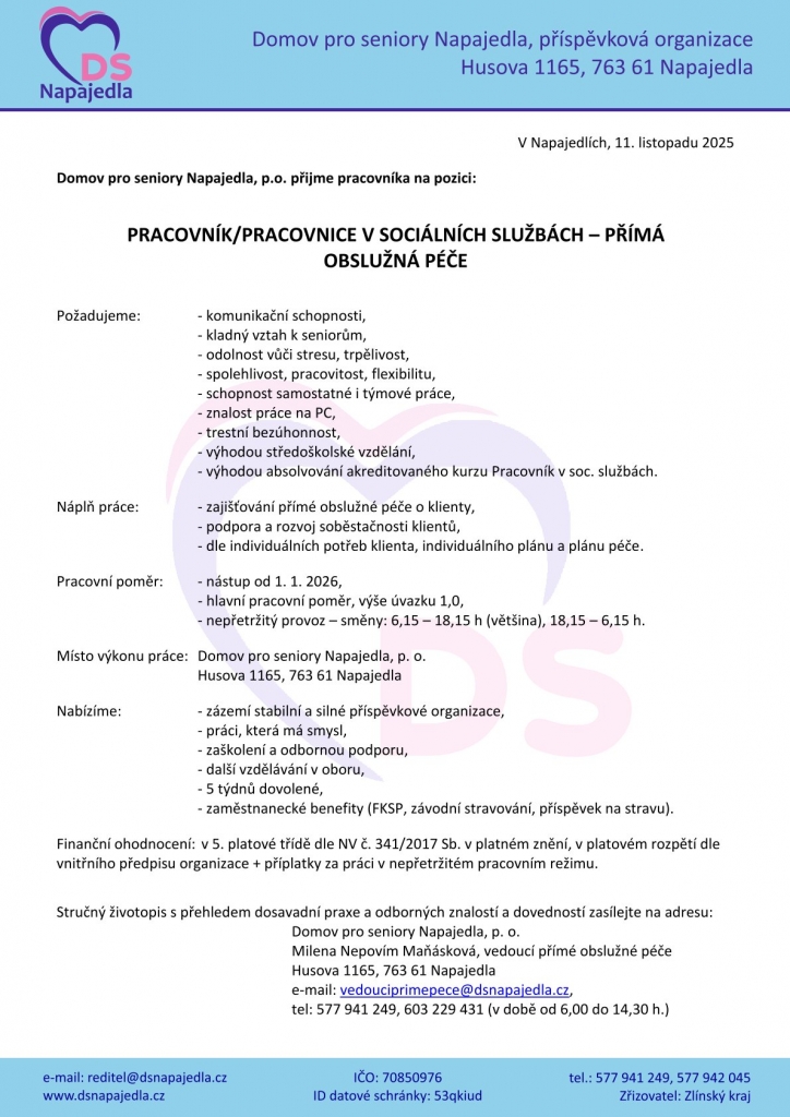 Nabídka práce - Domov pro seniory Napajedla 2025 - 2 pozice