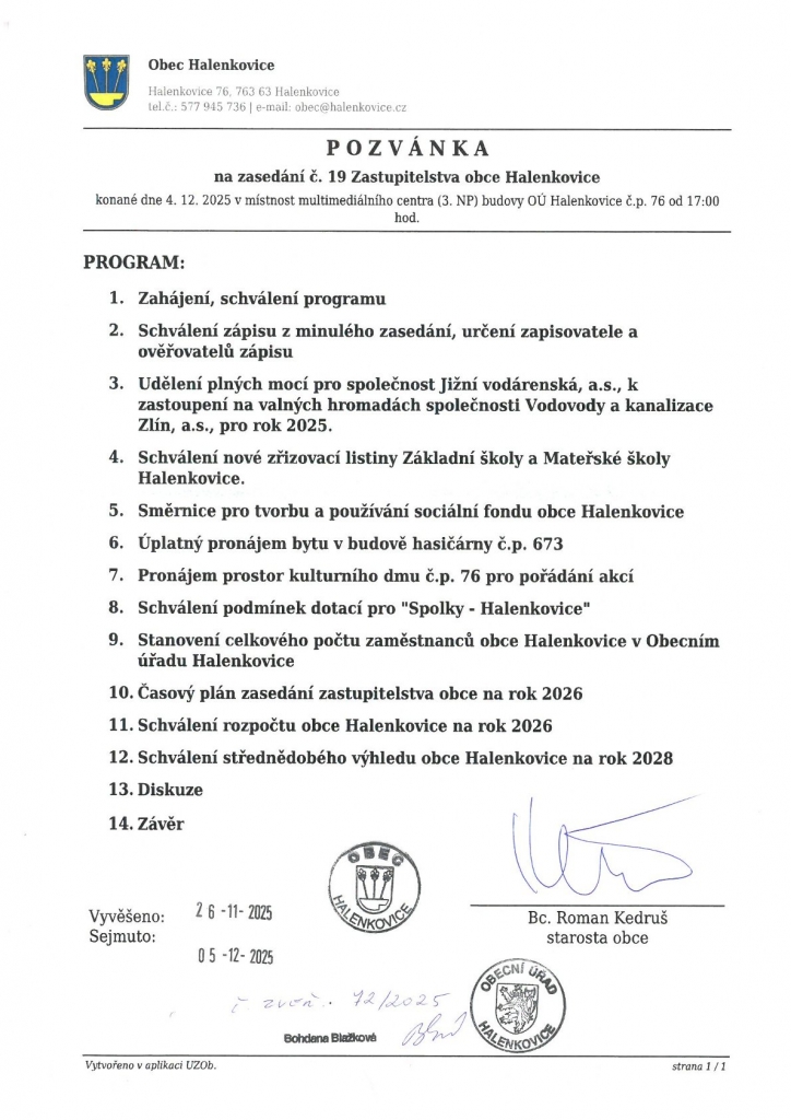 4. Pozvánka a program 19. zasedání Zastupitelstva obce Halenkovice